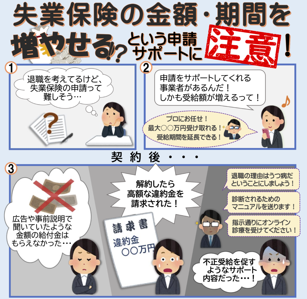 雇用保険に被保険者で要件を満たして給付金を受給することは当然に問題なく、その申請について適切なサポートであればいいのですが、中には不正受給を促すかのような誘導があったり、契約解約を申し出たら違約金を請求されることがあり、国民生活センターは注意を促しています。